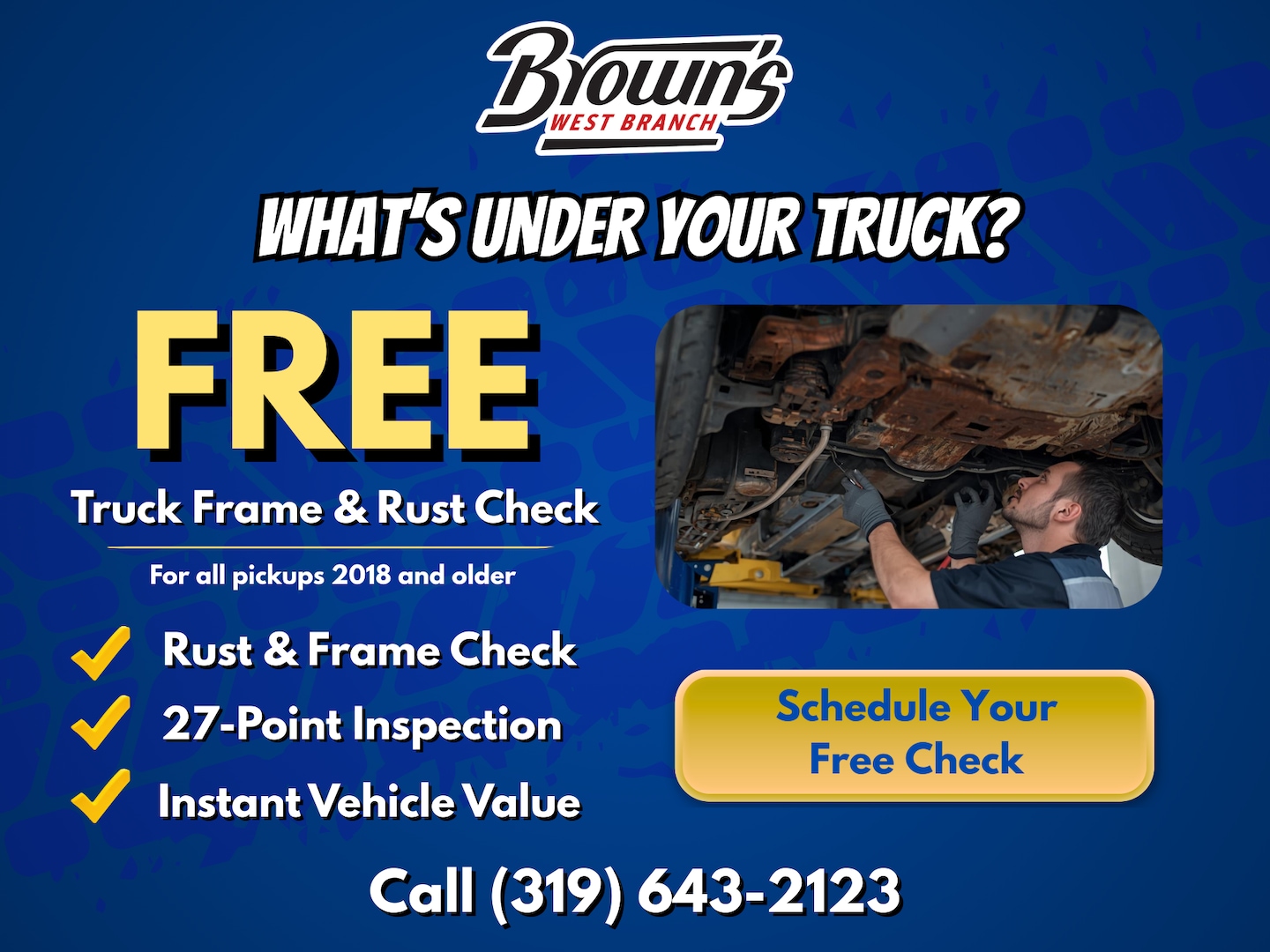 Just give us a call and ask for our FREE Rust & Frame Check. We'll put your truck on a lift, inspect the frame and underbody, and clearly explain what we see.